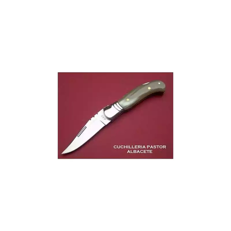 HOJA DE ACERO INOXIDABLE 440, MANGO EN CUERNO DE TORO, VIROLA Y FORROS DE ACERO INOX, SISTEMA DE CIERRE LOCKBACK