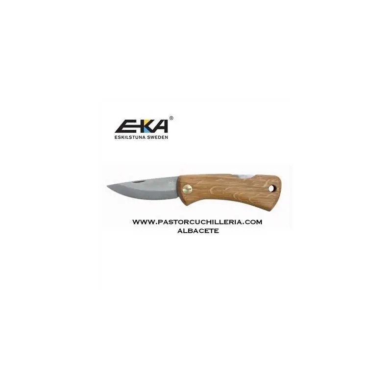 Eka (Suecia), hoja de acero inoxidable 12C27. Empuñadura en madera de roble con orificio para cordón fiador. Sistema de bloqueo Linerlock
