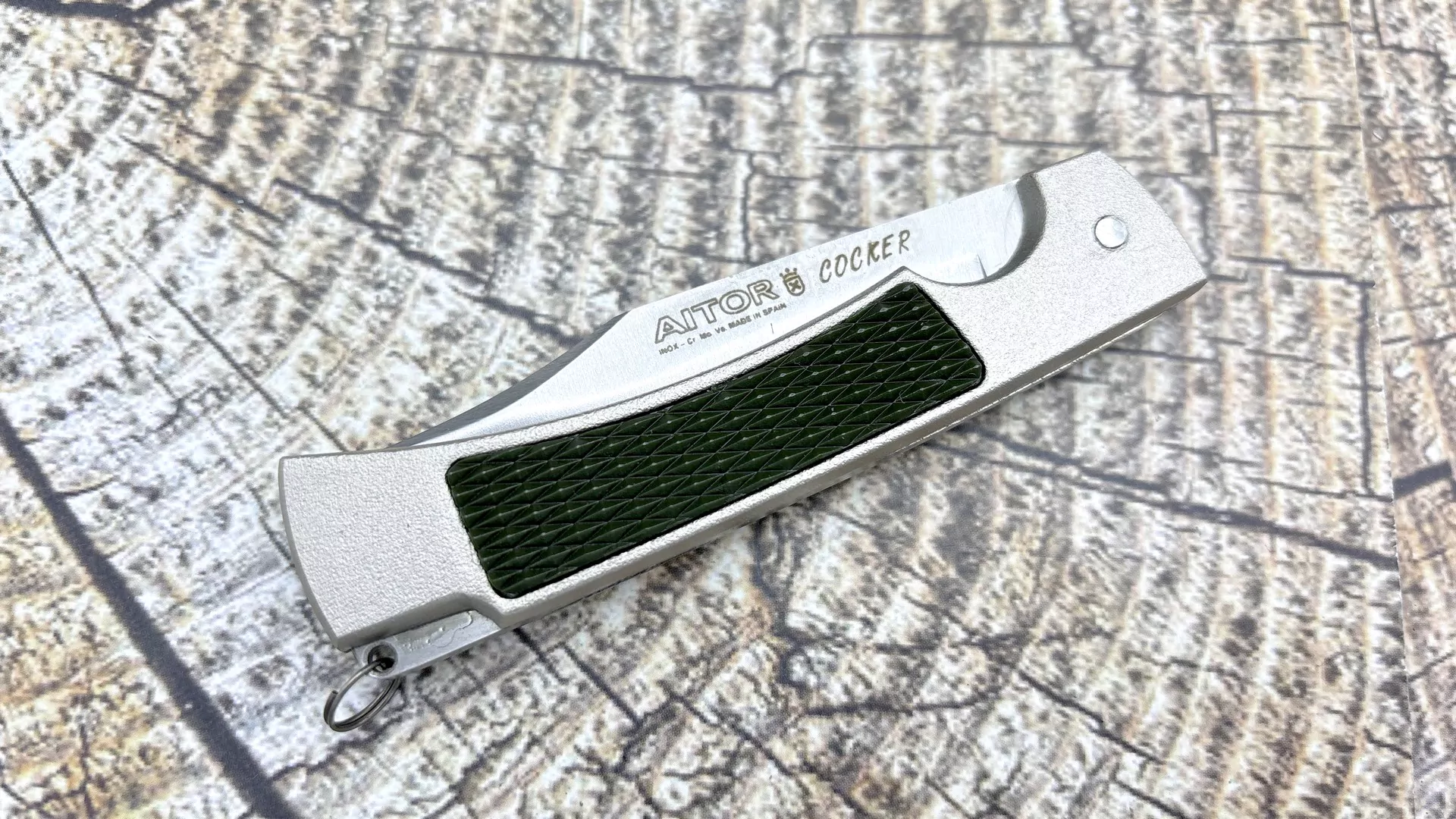 Navaja española Aitor cocker, hoja en acero inoxidable CrMoVa. Sistema de cierre de la hoja back lock. Empuñadura de aluminio anodizado . Cachas de abs verde. Anilla para colgar.