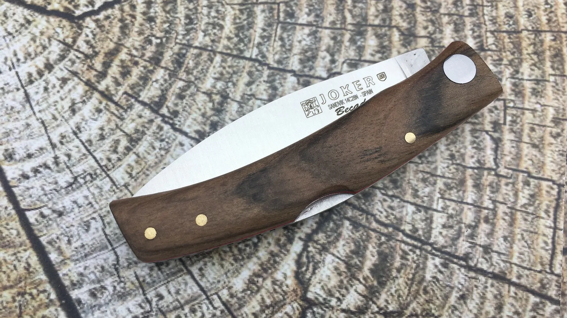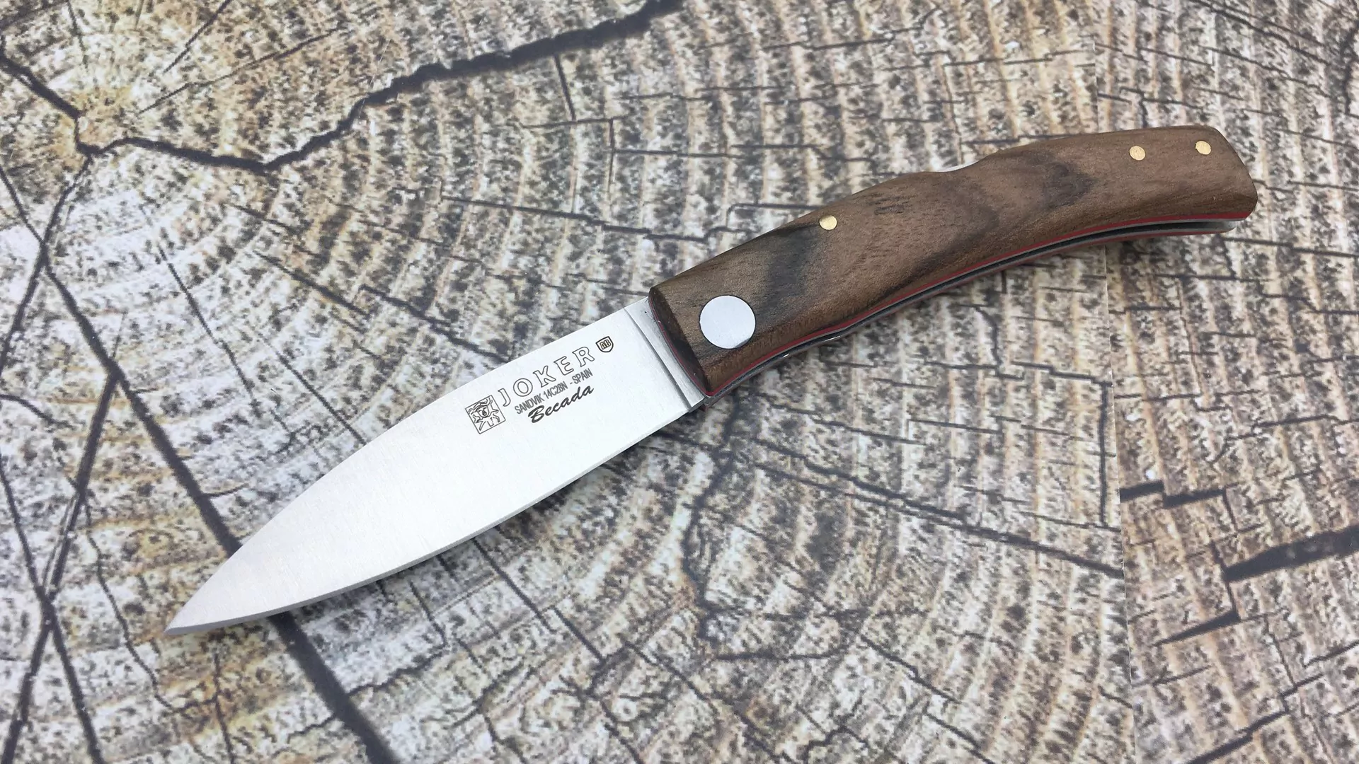 Navaja bolsillo, fabricada en Albacete (España). Hoja en acero inoxidable Molibdeno Vanadio. Mango en madera de Nogal, con forros en acero y separadores en fibra de color rojo. Sistema de bloqueo Lock- Back.